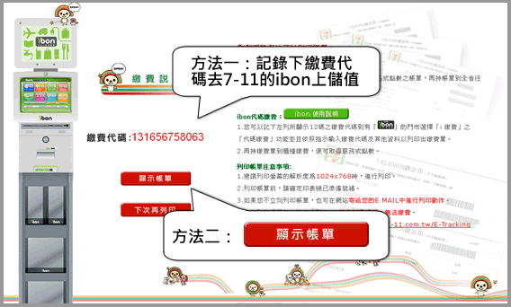請記錄下十二位 " 繳費代碼 " ,在 2 天內到 7-11 使用ibon 設備選擇【繳費】之【代碼繳費】功能,並且依照指示輸入繳費代碼及其他資料以列印出繳費單。